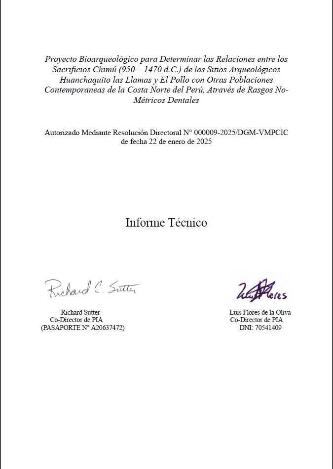 Sutter y Flores 2025 “Proyecto Bioarqueológico para Determinar las Relaciones entre los Sacrificios Chimú (950 – 1470 d.C.) de los sitios arqueológicos Huanchaquito Las Llamas y El Pollo con otras poblaciones contemporáneas de la costa norte del Perú"